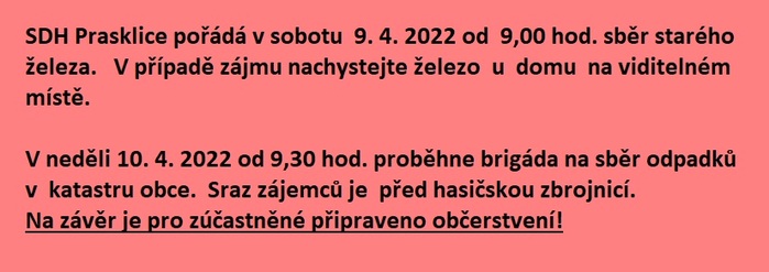 SDH Prasklice pořádá v sobotu 9. 4. 2022 od 9,00 hod. sběr starého železa. V případě zájmu nachystejte železo u domu na viditelném místě.