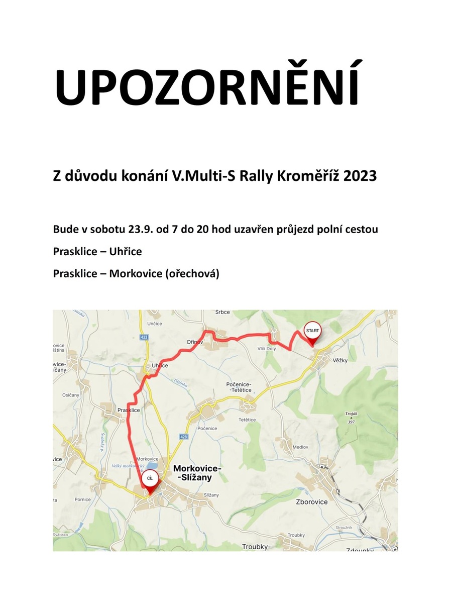 Úvod > Obec > Aktuality a hlášení > Upozornění - uzavření cesty - Rally Kroměříž