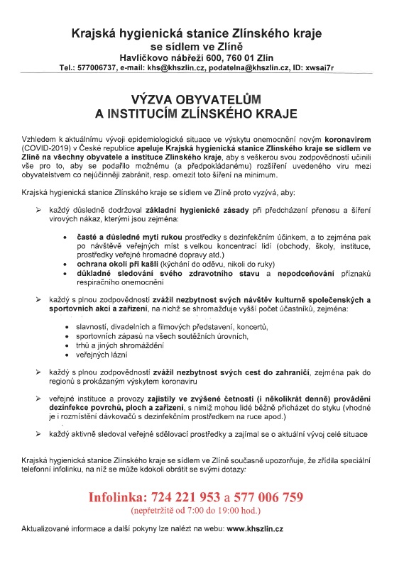 Úvod > Obec > Aktuality a hlášení > Výzva KHS Zlín COVID-19